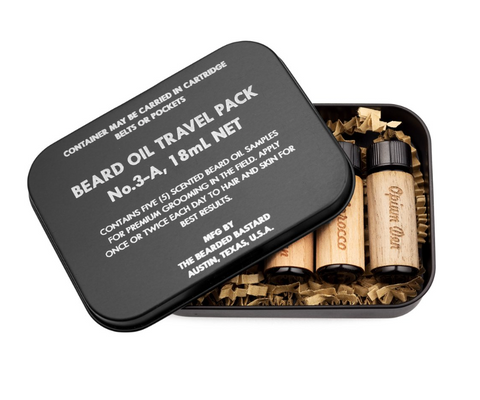 One of the coolest aspects of the Travel Pack is the gold tin. Inspired by WWII-era standard issue U.S. tins, our Beard Oil Travel Kit is the perfect rugged travel companion for keeping your beard looking healthy and smelling good out in the field. Even after all the beard oil is gone, this tin will be traveling with you for years to come. Each pack contains samples of five of our classic beard oil scents